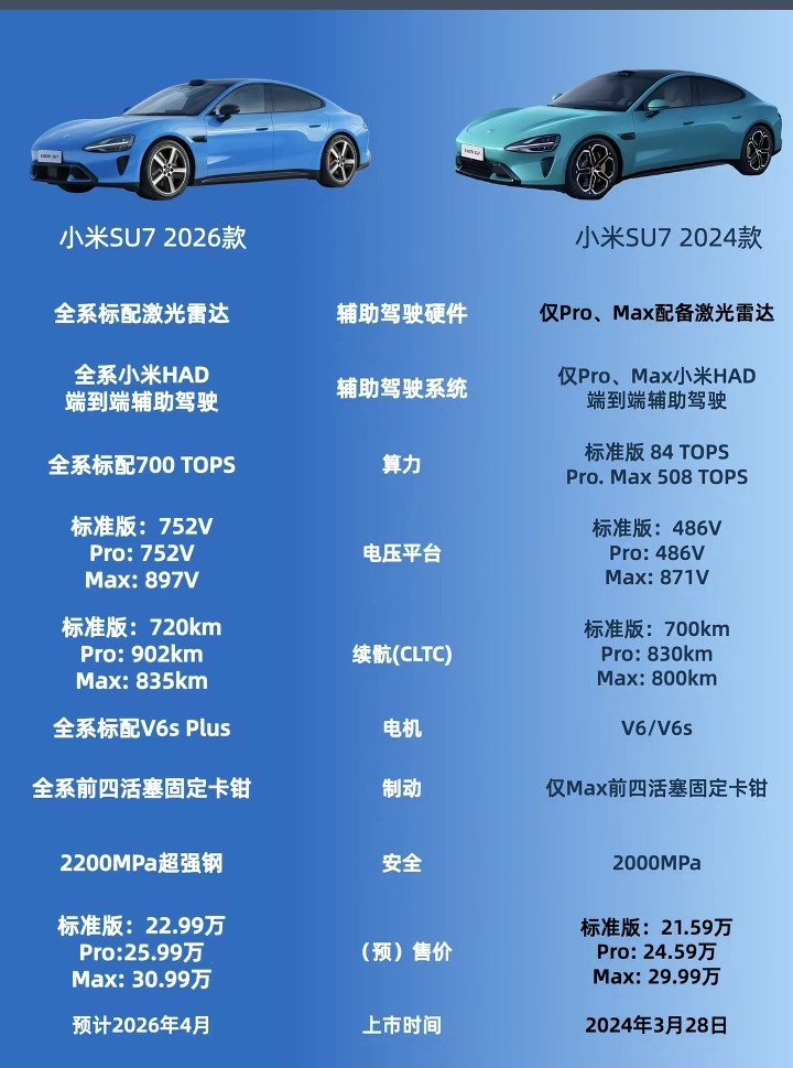 新一代小米SU7通过全系标配激光雷达、智能驾驶系统等中枢升级,商场竞争力获得了显耀增强。这款改款车型并非通俗修补,而是在用户最照管的智能、安全和体验上作念了换代级别的擢升。 智能驾驶:全系标配的底气 最引东说念主审视的变化是智能驾驶的门槛被大幅拉低。新一代SU7全系标配了车顶激光雷达和4D毫米波雷达,衔尾原有的11颗高清录像头,构建了360度的感知体系。这意味着即使是预售价22.99万元的要领版,也具备了好意思满高阶补助驾驶的硬件基础。