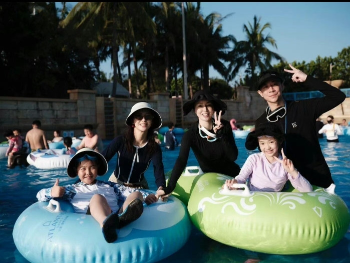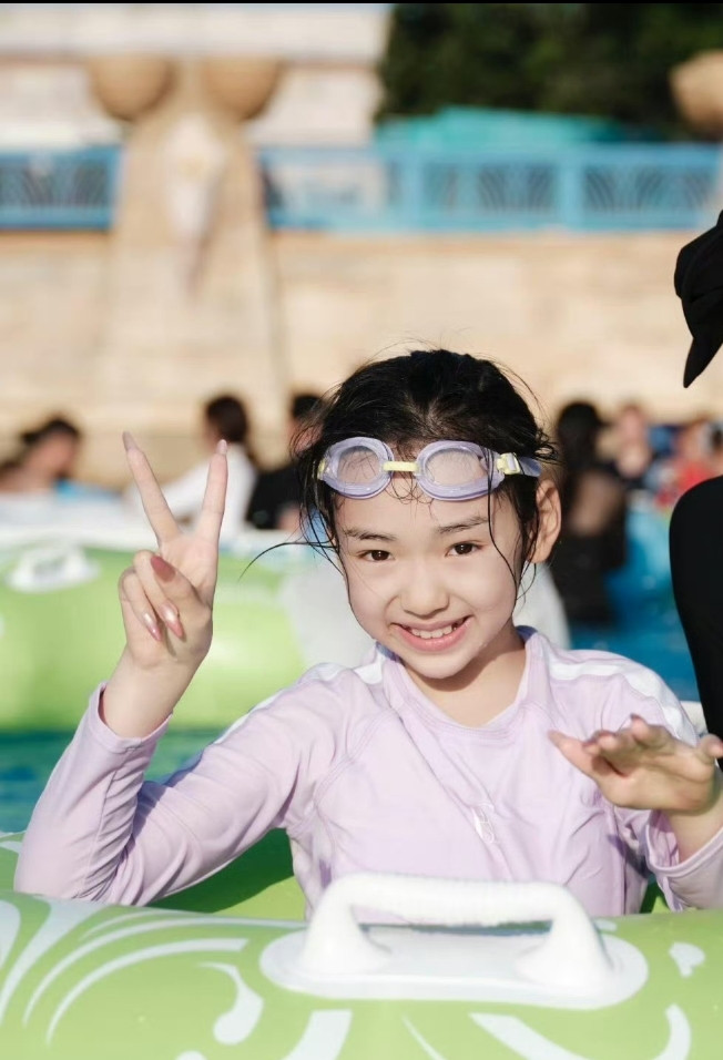 兄妹俩坐在浮具里溅起水花/全家在泳池比耶大笑 「防水甲片+裸色系=泳池隐形战甲」 「水光折射等于最自然的滤镜」 「宝贝的欢快比阳光更细心」